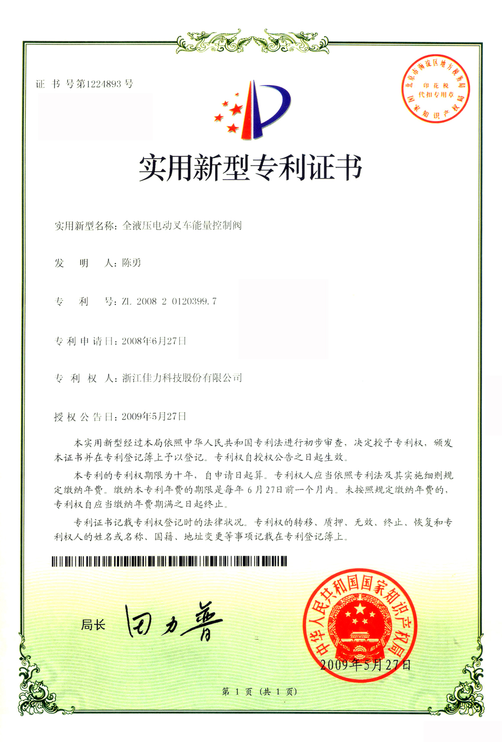 實用新型專利證書