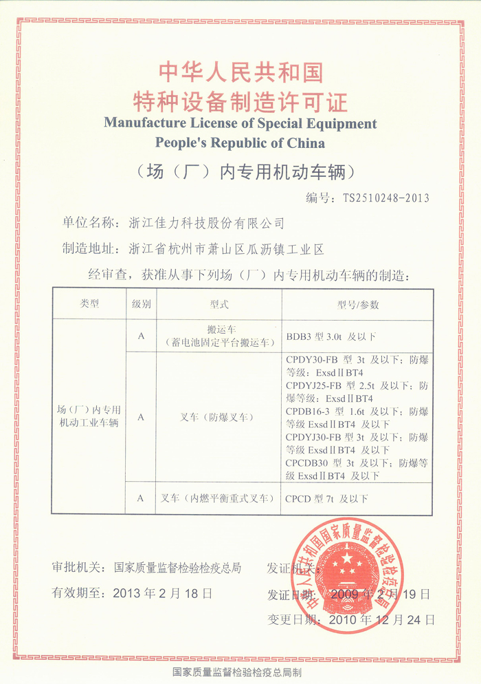 場(廠)內(nèi)專用機動車輛特種設(shè)備制造許可證